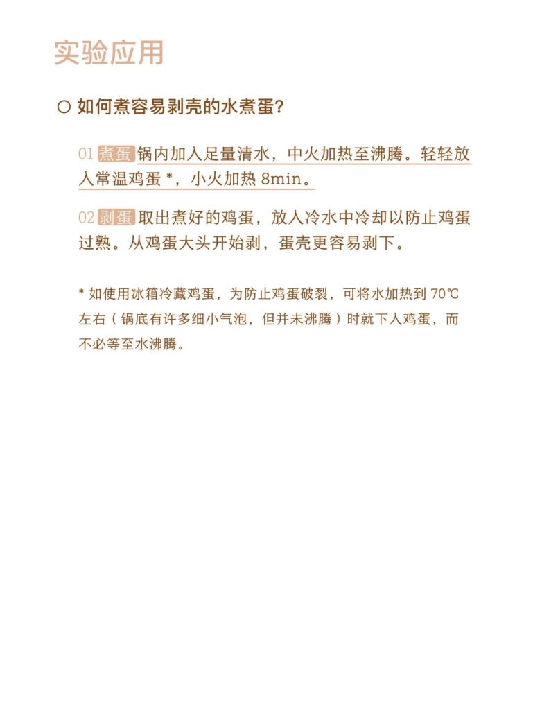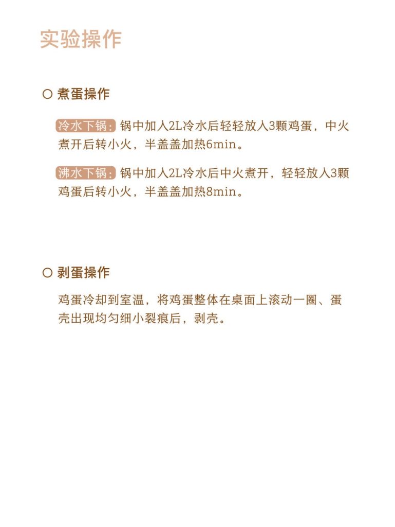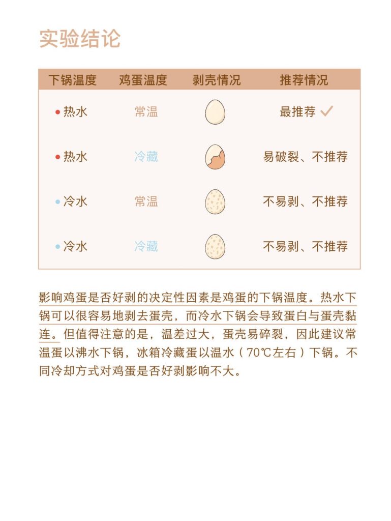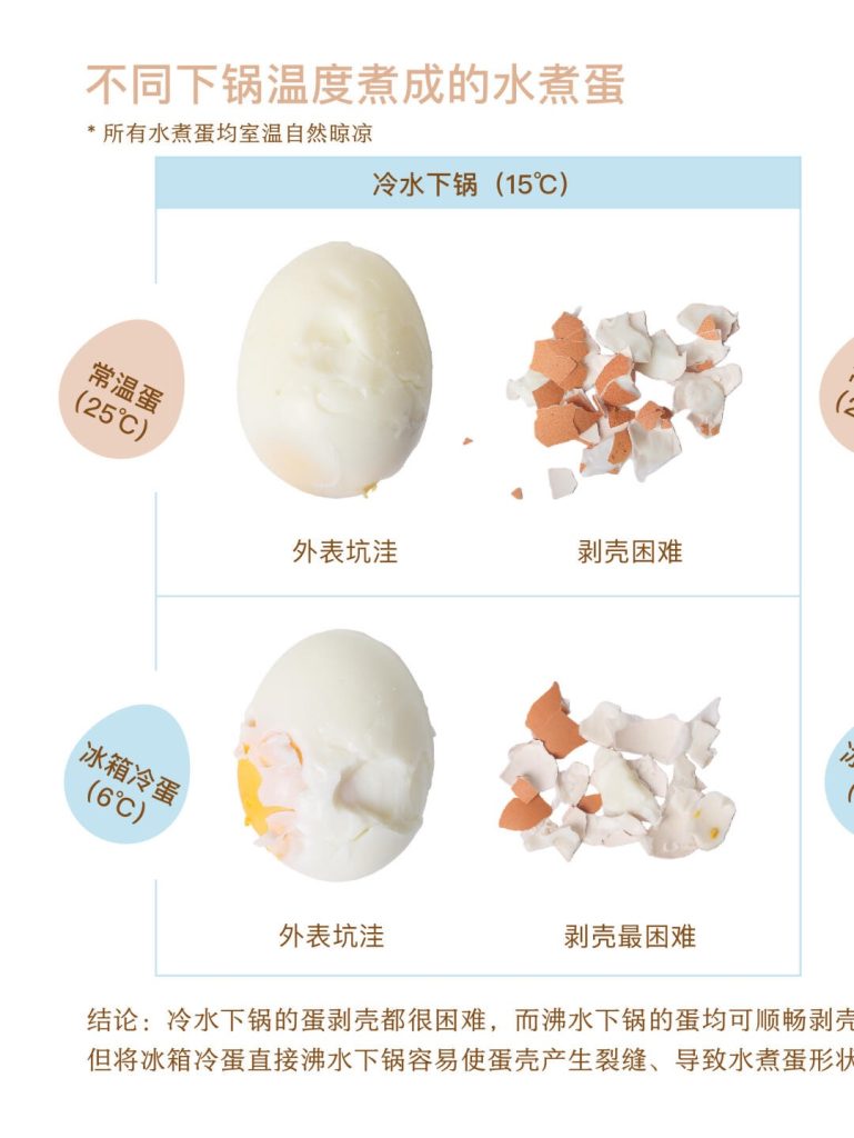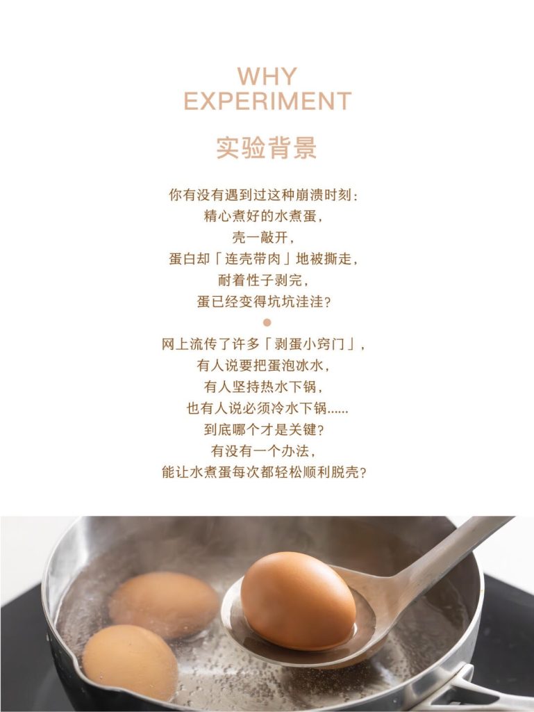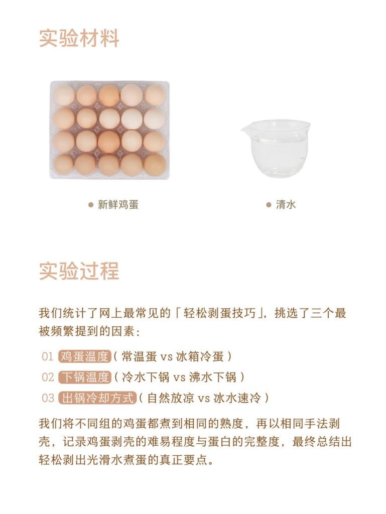 我们将不同组的鸡蛋都煮到相同的熟度,再以相同手法剥壳,记录鸡蛋剥壳的难易程度与蛋白的完整度,蕞终总结出轻松剥出光滑水煮蛋的真正要点。