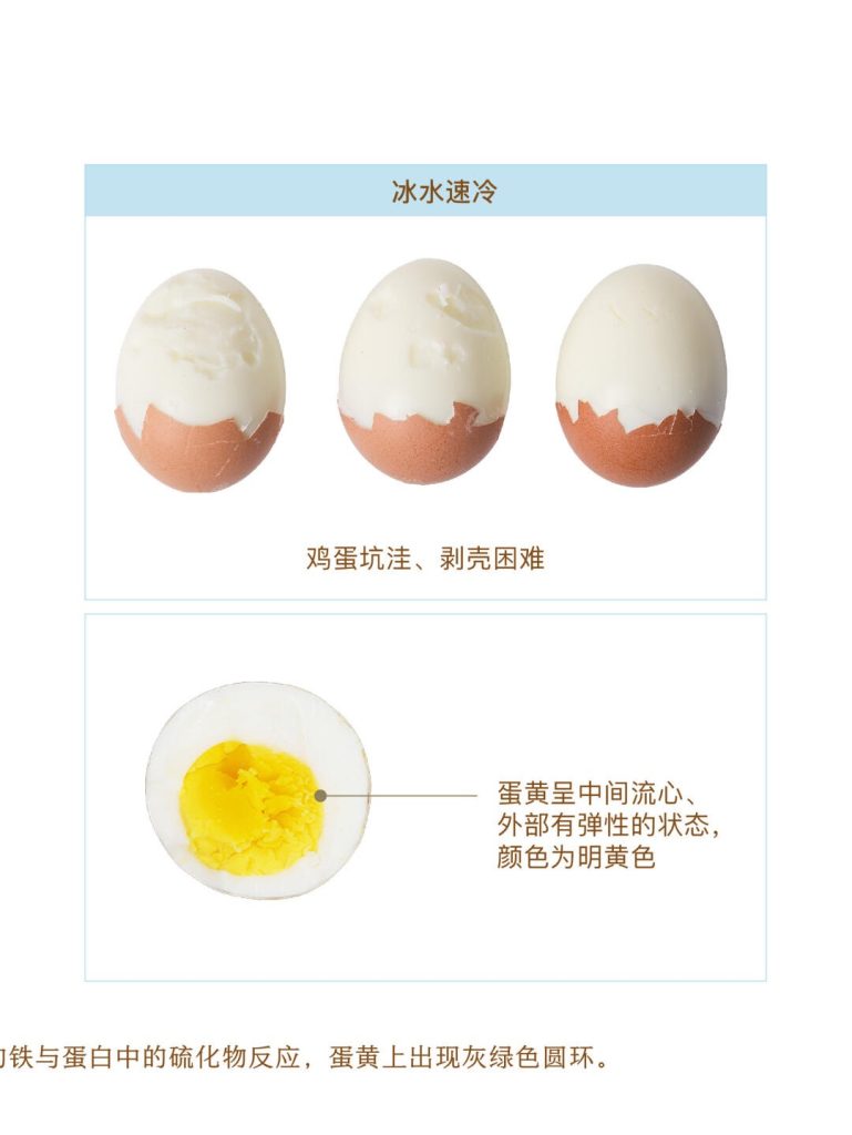 影响鸡蛋是否好剥的决定性因素是鸡蛋的下锅温度。热水下锅可以很容易地剥去蛋壳,而冷水下锅会导致蛋白与蛋壳黏连。但值得注意的是,温差过大,蛋壳易碎裂,因此建议常温蛋以沸水下锅,冰箱冷藏蛋以温水(70℃左右)下锅。不同冷卻方式对鸡蛋是否好剥影响不大。但冰水速冷可以防止余温对鸡蛋持续加热导致鸡蛋过熟、蛋黄中的铁与蛋白中的硫化物反应,蛋黄上出现灰绿色圆环。