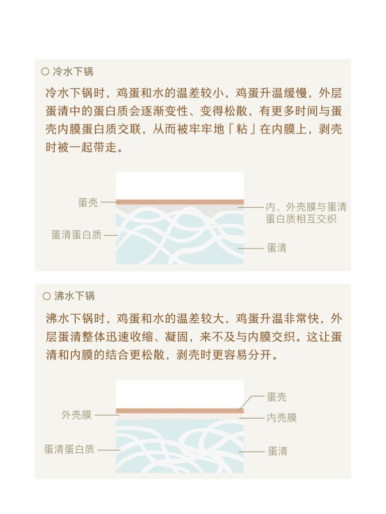 冷水下锅时,鸡蛋和水的温差较小,鸡蛋升温缓慢,外层蛋清中的蛋白质会逐渐变性、变得松散,有更多时间与蛋壳内膜蛋白质交联,从而被牢牢地「粘」在内膜上,剥壳时被一起带走。